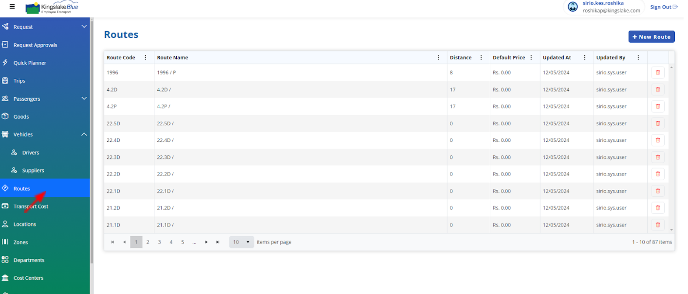 Default Charge (LKR): The price of a route