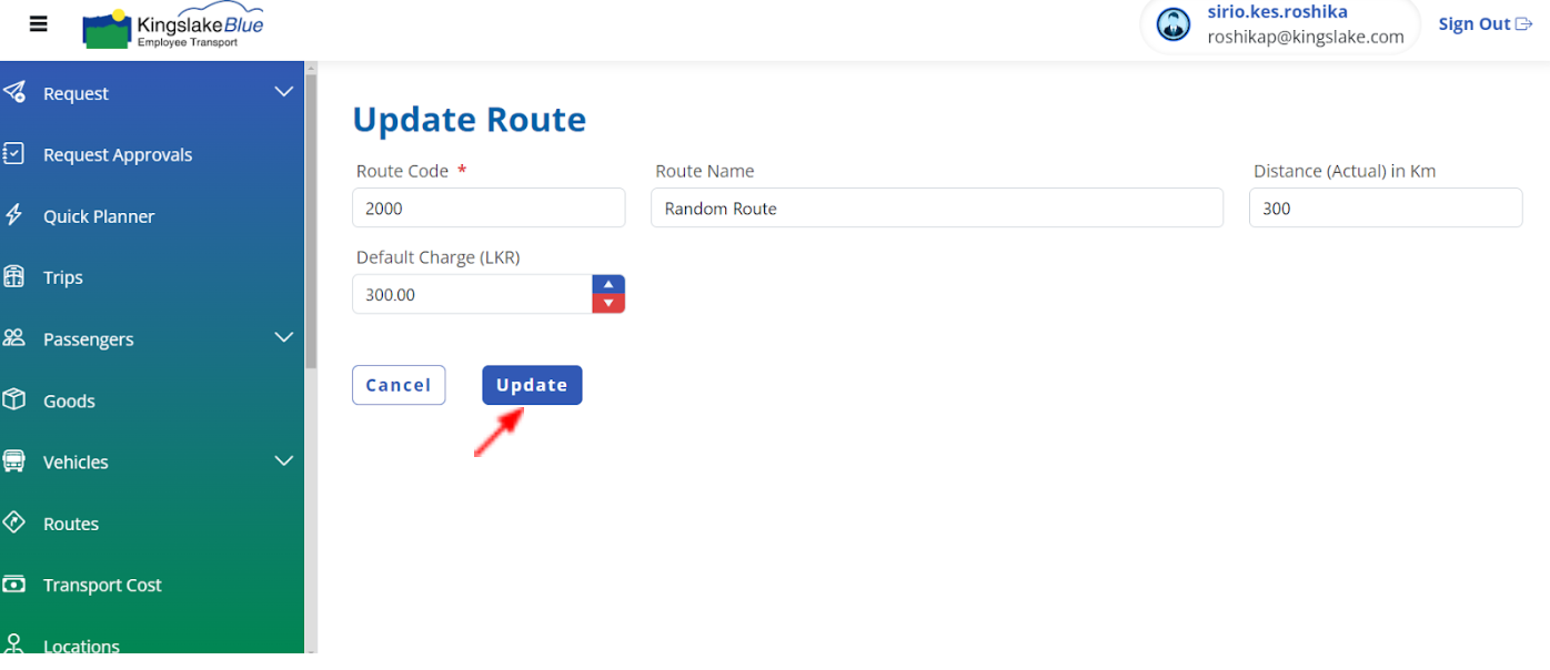 To edit an existing route, select it from the list and use the "Update" button on the Update page.